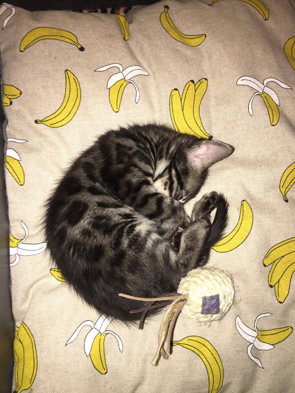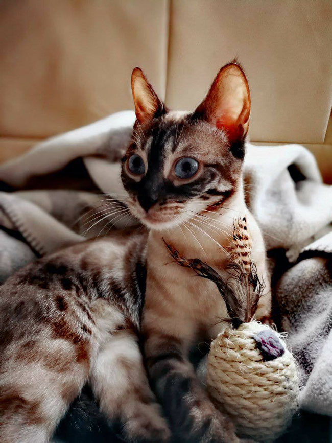 Ich danke claudia & Henning von den Wildfruits-Bengalkatzen für diese tollen Schnappschüsse. Die kleine Banana schläft seelenruhig neben einer Ledermaus, der kleine Butternut sitzt verträumt hinter einer Federmaus & auf den unteren